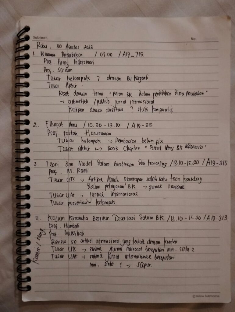 Semester ganjil tahun akademik 2023-2024 ditempuh dengan 4 MK yang menarik dan wajib untuk diperdalam yakni Filsafat Ilmu, Wawasan Pendidikan, Teori dan Model BK, dan Kajian Kerangka Berpikir Disertasi Dalam BK. Mari kita perdalam pembahasan pada buah tangan masing-masing MK yang ada.